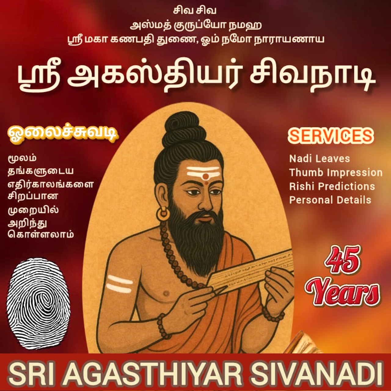 "Welcome to Sri Agasthiyar Siva Nadi, where every seeker is received with respect and compassion, ensuring they receive the divine guidance destined for them. Whether you are seeking clarity, facing life’s challenges, or walking the path of self-discovery, our readings bring direction, healing, and peace. Here, you experience the true spiritual legacy of Nadi astrology in its most authentic form."